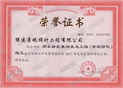 鄭東新區(qū)象湖榮獲鄭州市風景園林協會2017年度優(yōu)良園林綠化工程