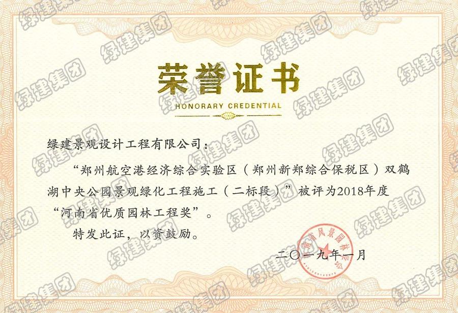 雙鶴湖二標(biāo)榮獲2018年度河南省優(yōu)質(zhì)園林工程獎